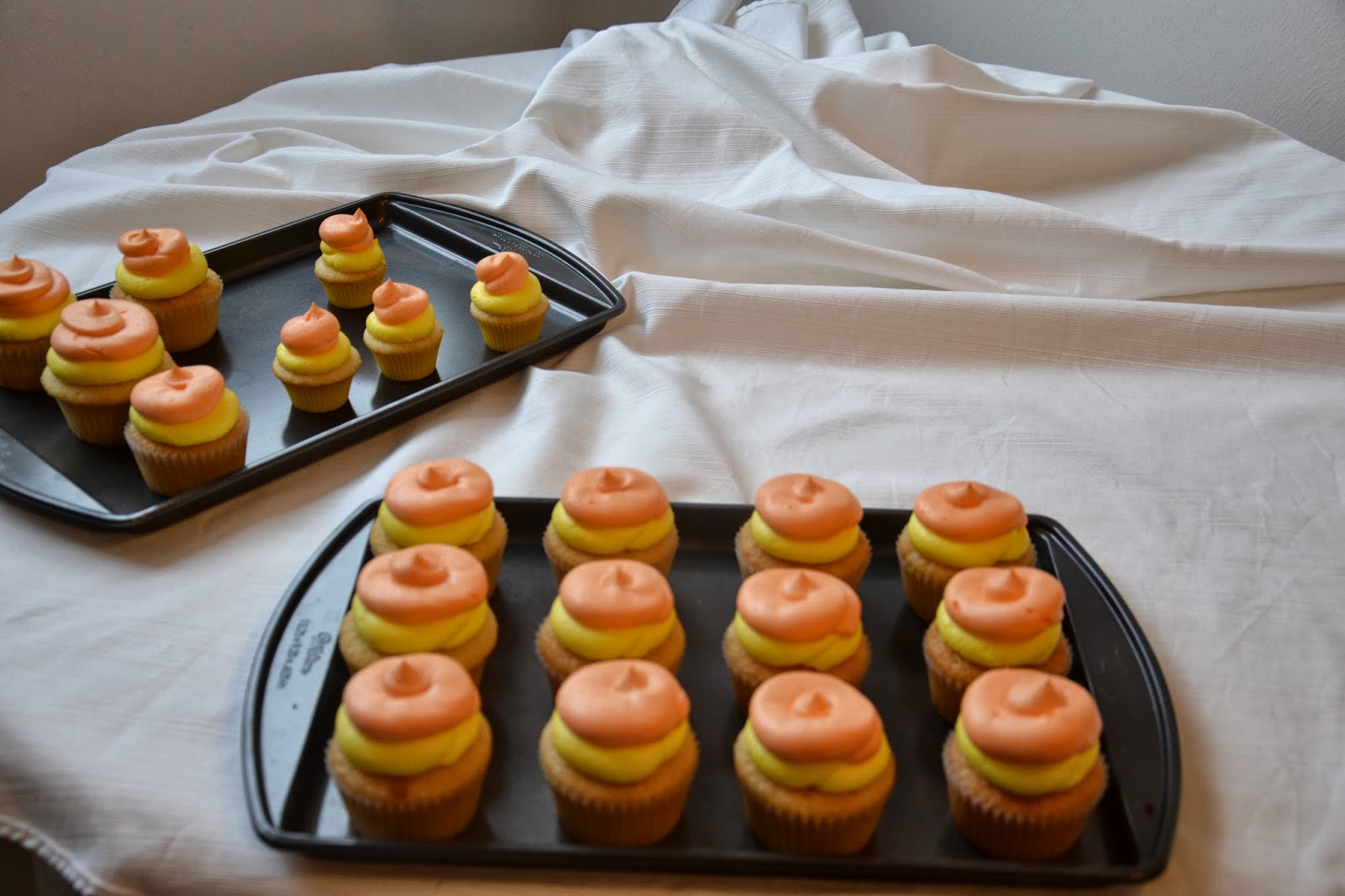And finally a bit of white on top. The technique I used for the top was not a swirling movement, but something similar to filling an ice cream cone – using pressure to fill the top and then pulling the icing away. Normally I wouldn’t add the candy corn, but I thought it would help our German friends make the connection of the candy inspiration to the cupcake.