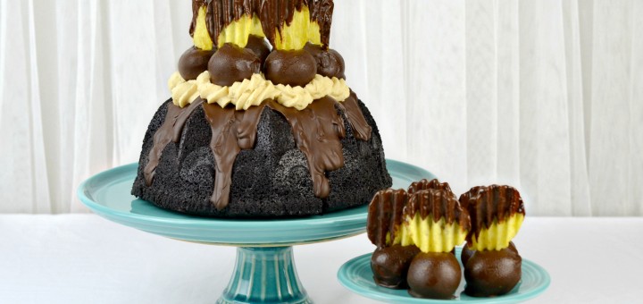 Dark Chocolate Bundt Cake, Lindt Chocolate Lava, Peanut Butter Buttercream, and Peanut Butter BonBons with Chocolate Dipped Potato Chips All this chocolate and peanut butter and crunchy, salty potato chips? This cake right...