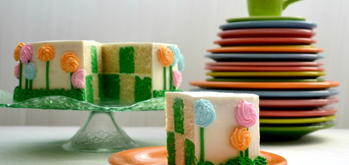 Vanilla Checkerboard Cake, Vanilla Buttercream Filling, and tinted Vanilla Buttercream Flowers This is a fun, fun cake to bake and build. Of course, attention to detail takes on a peculiar meaning with this...