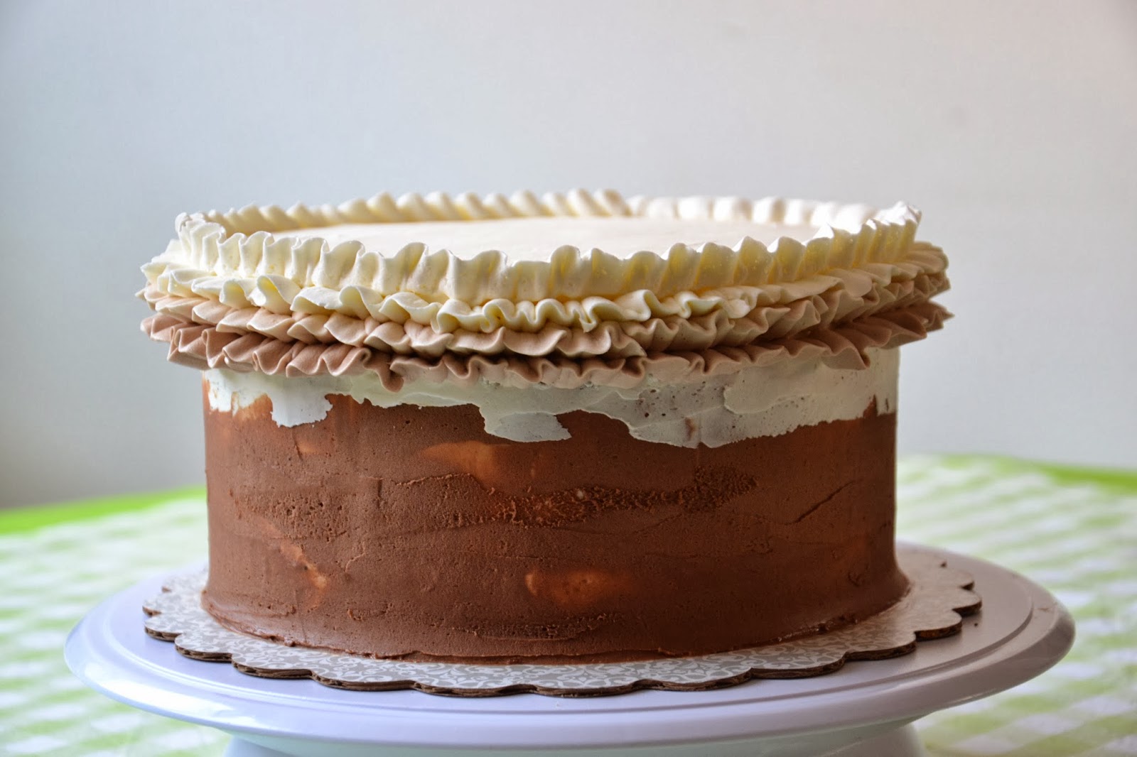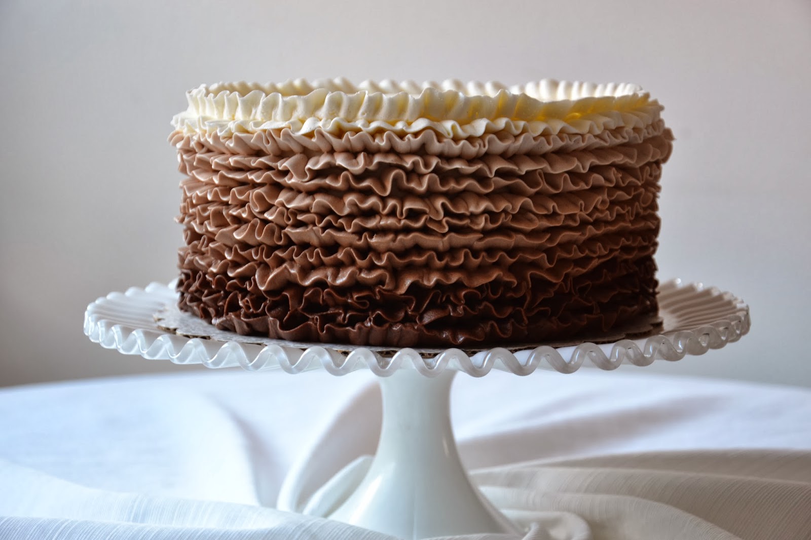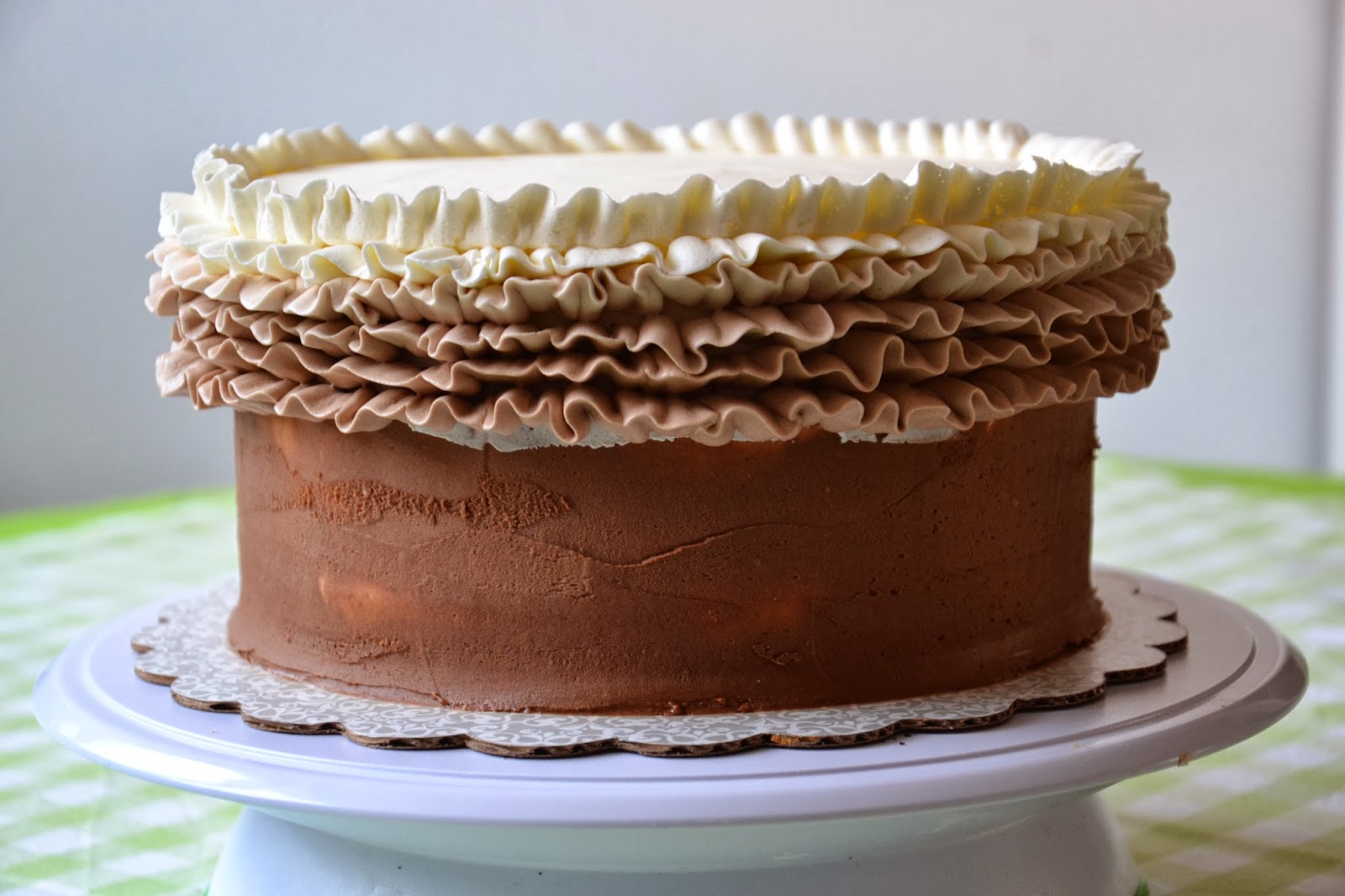 Because of the change in color of the frosting, the bottom half of the cake needed a coat of chocolate buttercream as the background in case some of the base was noticeable through the ruffles.