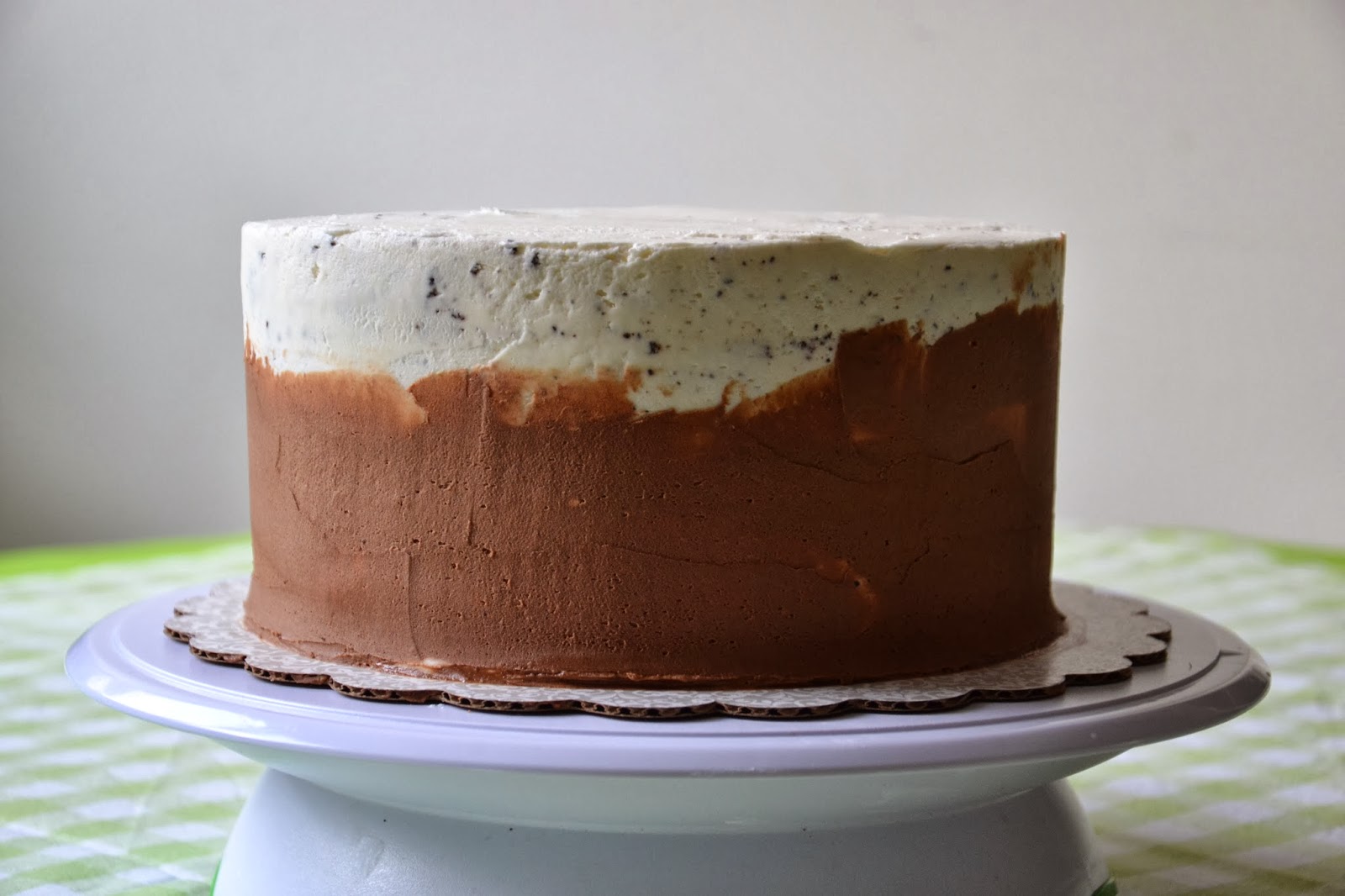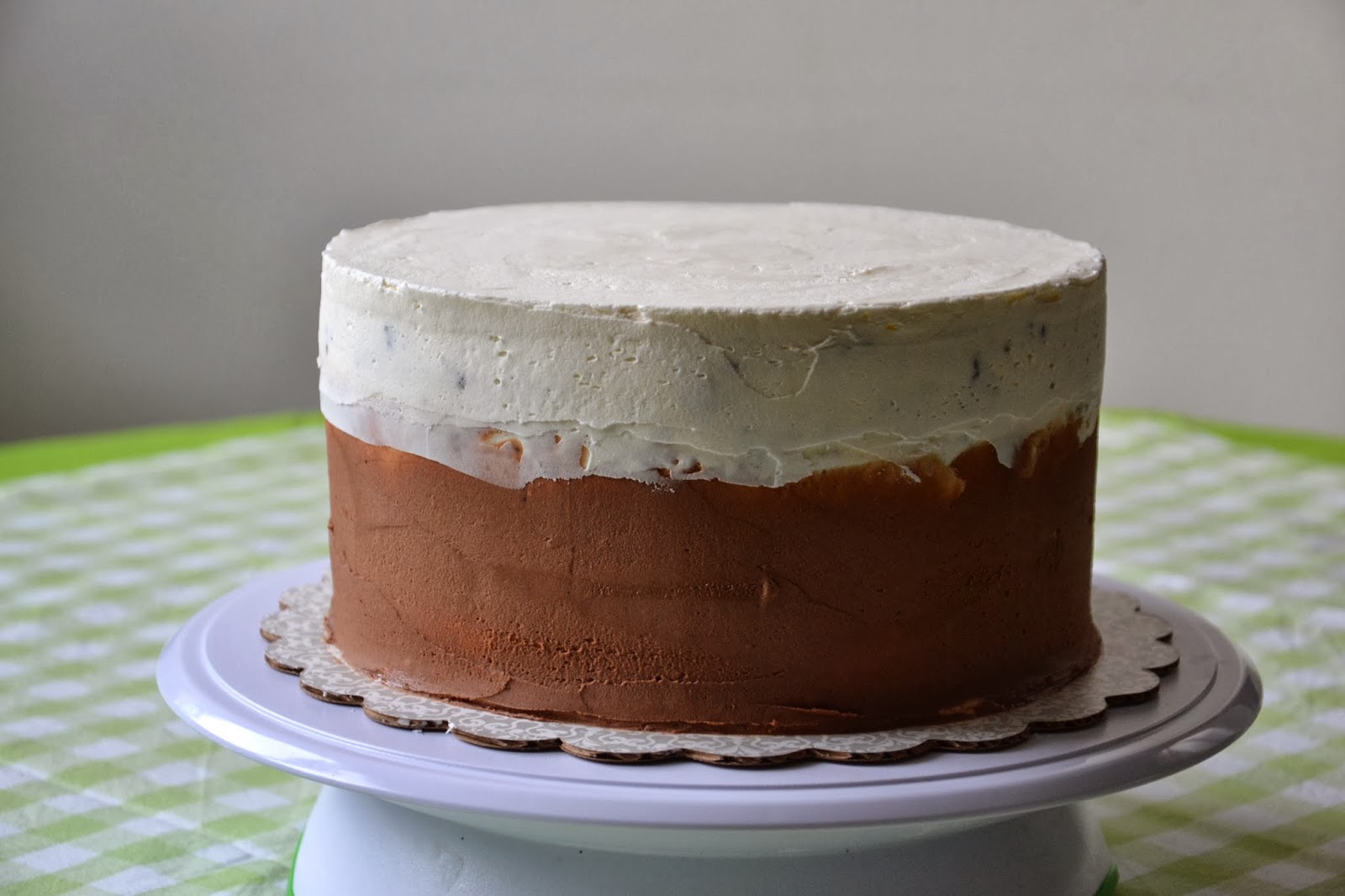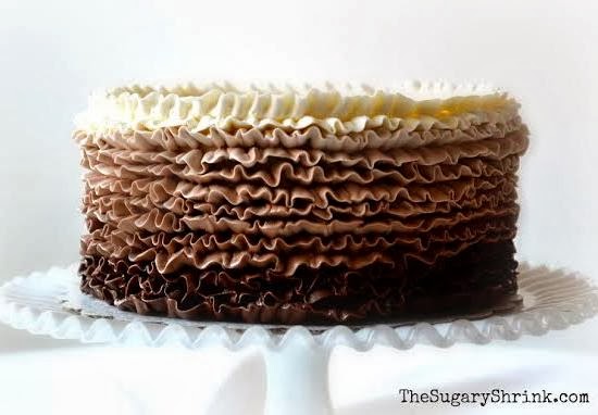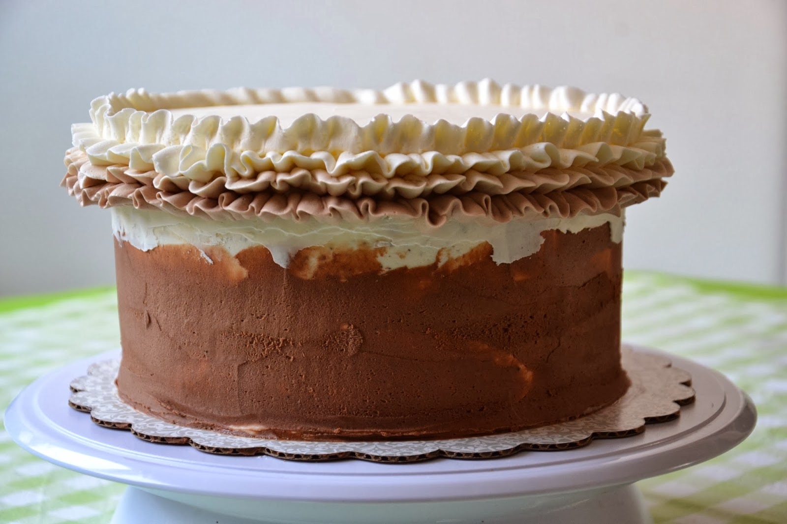 Because of the change in color of the frosting, the bottom half of the cake needed a coat of chocolate buttercream as the background in case some of the base was noticeable through the ruffles.