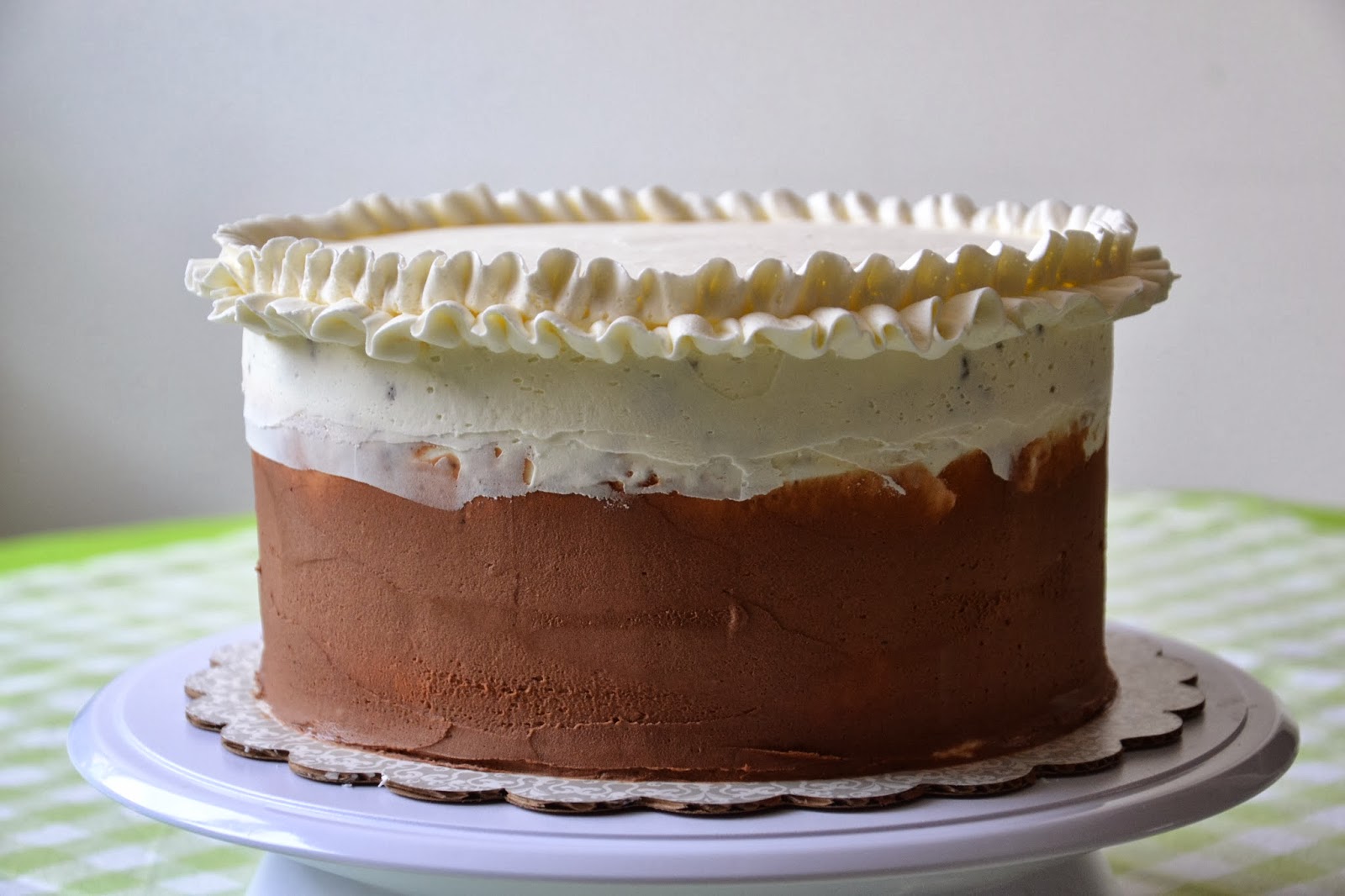 The final layering of vanilla is primarily just the top surface. The first couple layers of ruffles are vanilla and then I slowly added chocolate ganache (55% dark chocolate and heavy whipping cream). By the bottom layers, it was just whipped ganache with a bit of added powdered sugar.