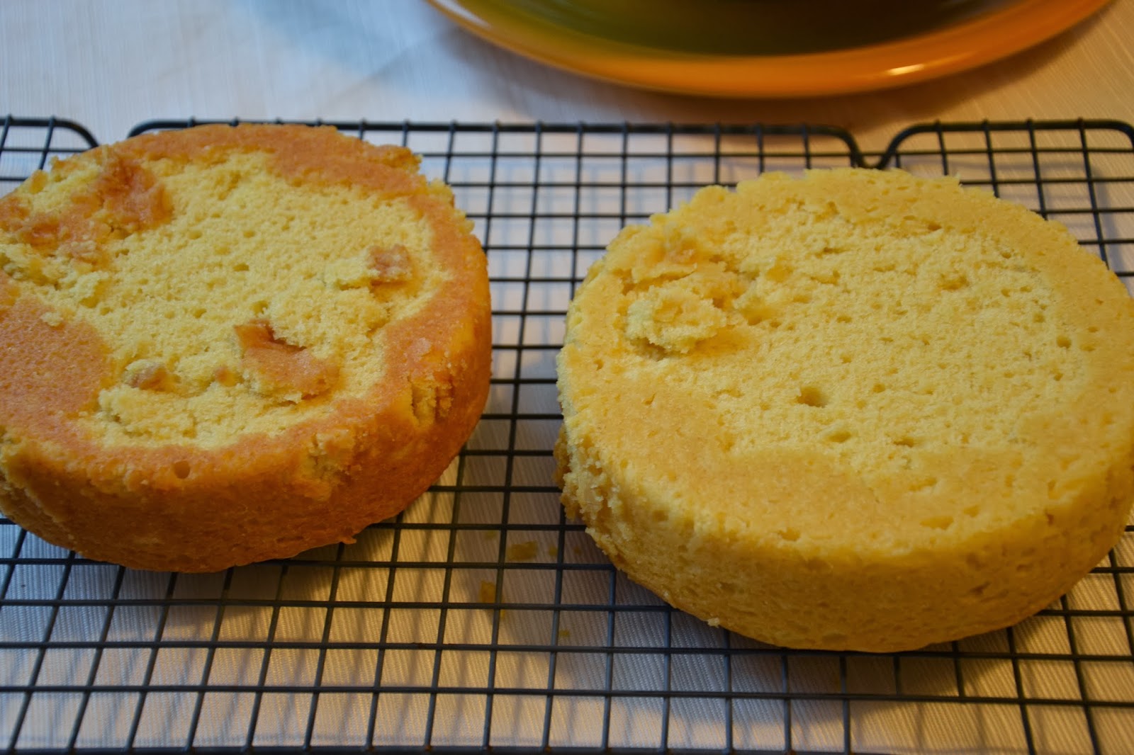 The cake baked up well, but I decided to take a short cut and not use parchment paper rounds at the bottom of the pan.  Usually that’s ok, but with the thickness of the cake layer and probably taking it out of the oven a minute or two soon…this is what happened when they were upturned.  Not that it matters all that much once the filling is on, but it’s not a best practice.
