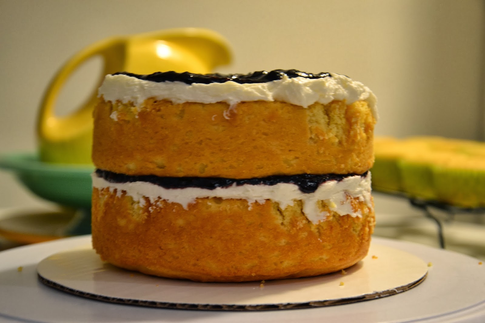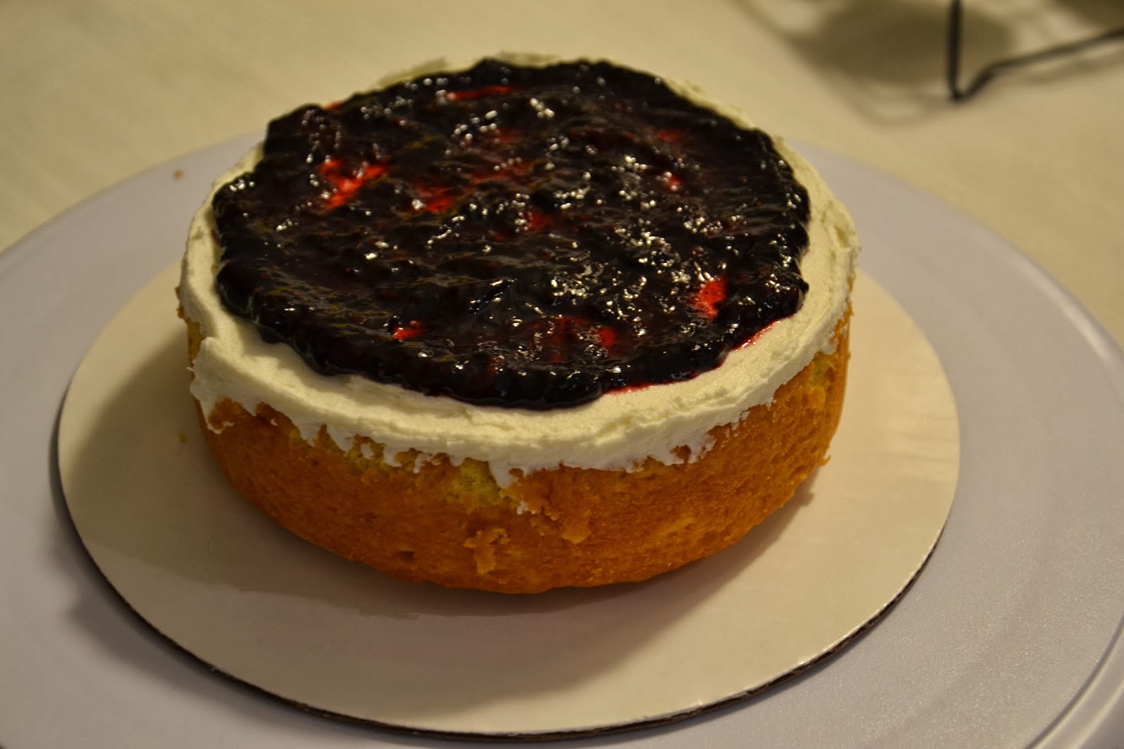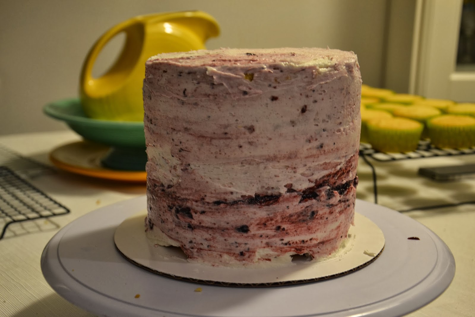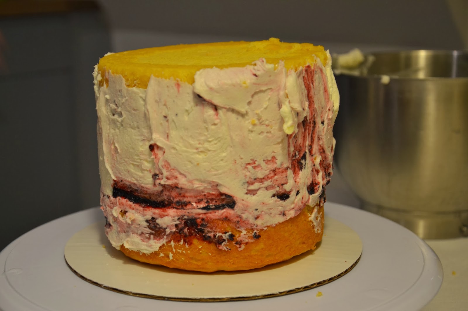 Stacking the cake…I’d have preferred a fresh berry compote, but didn’t have enough blueberries (there were pricey enough as it was!).  Instead, I opted for the blueberry preserves work around.  Starting with the bottom layer of cake, then adding a lemon cream cheese buttercream, and finally a bit of preserves.  It layered quite nicely…until the crumb coat.