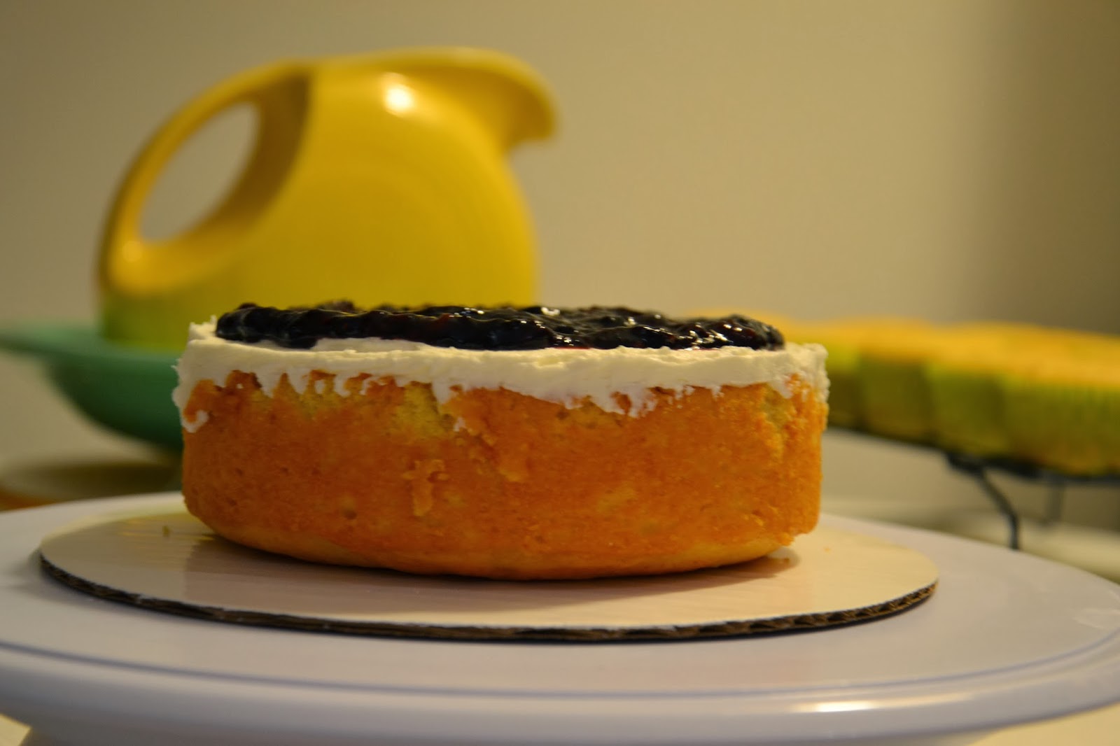 When the fresh blueberry compote was cooled and ready, I slowly spooned the it on top  of the cake…gently coaxing it to the edge.