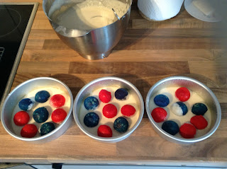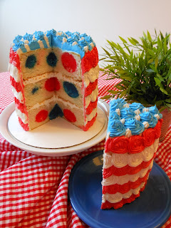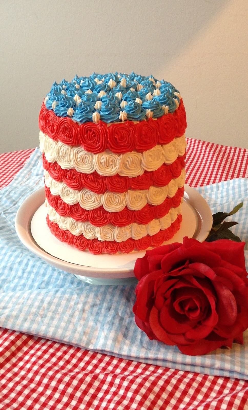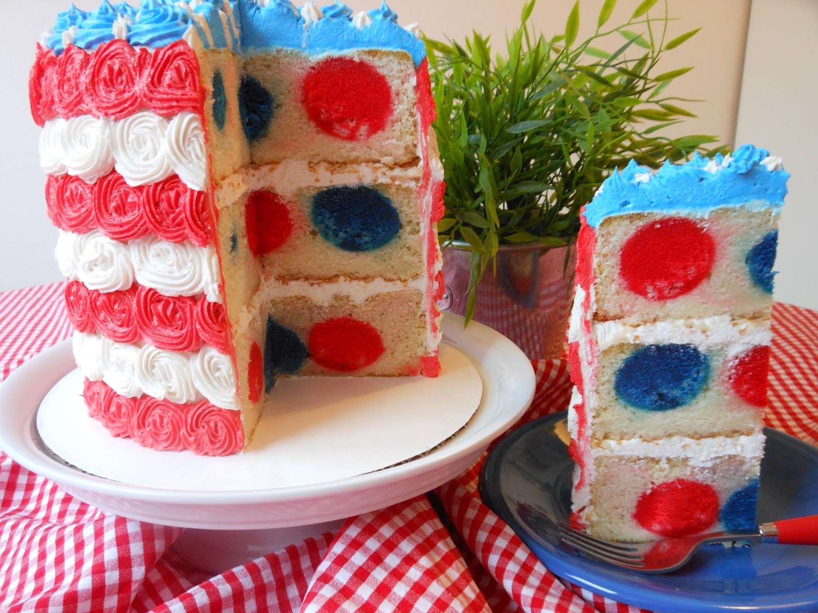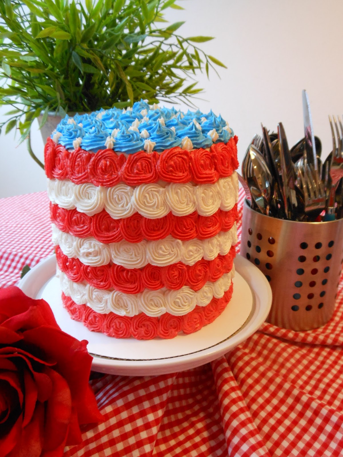 Polka Dot Cake – I knew this would be perfect. The discussion (or maybe I was the only one doing the talking?) was still about how to decorate the cake. I was leaning toward reflecting the stripes of the flag going around the cake.. but how? Ruffles would look great. Rosettes would work too. Maybe an up/down, sloppy/stylish swirl?