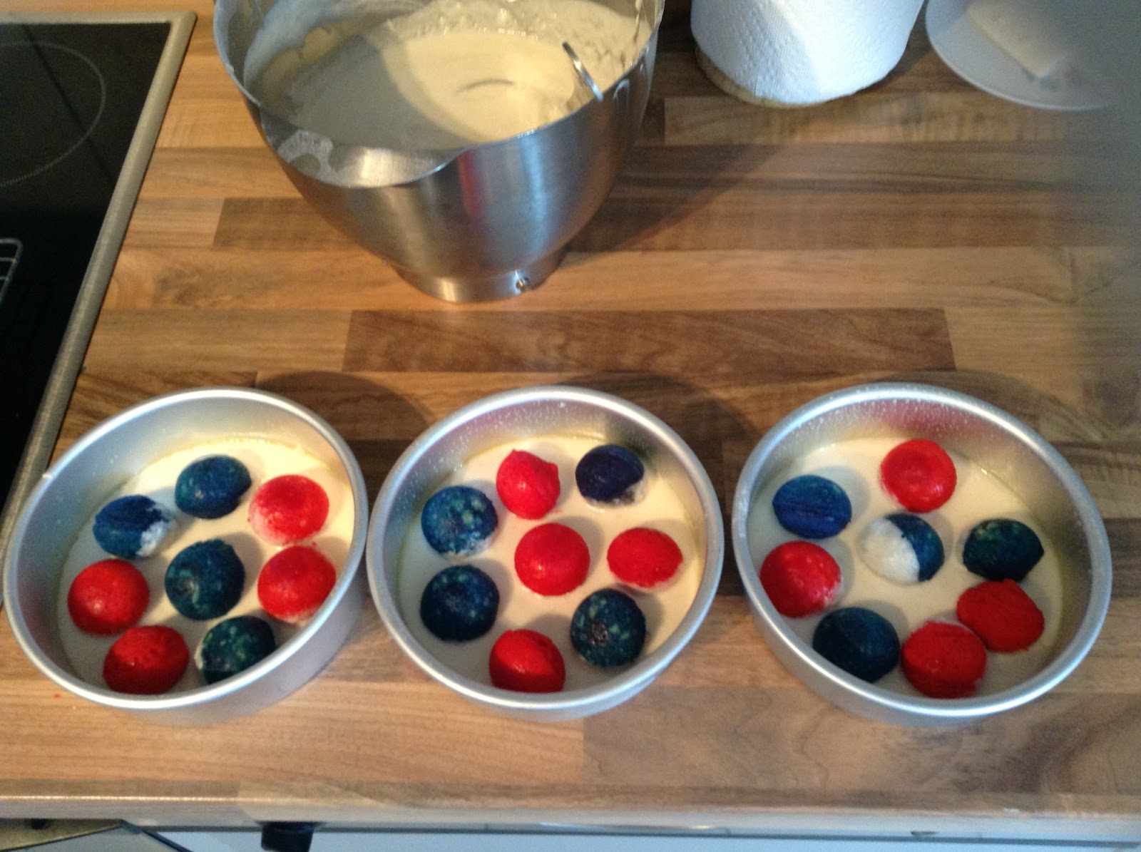 Triple-layer, 6″ round White Cake with Blue & Red baked cake pops