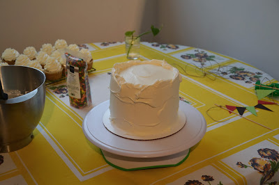 After smoothing away the troughs in the buttercream, I tried a small banner.  I need to work on my banner-making skills.  Sigh.