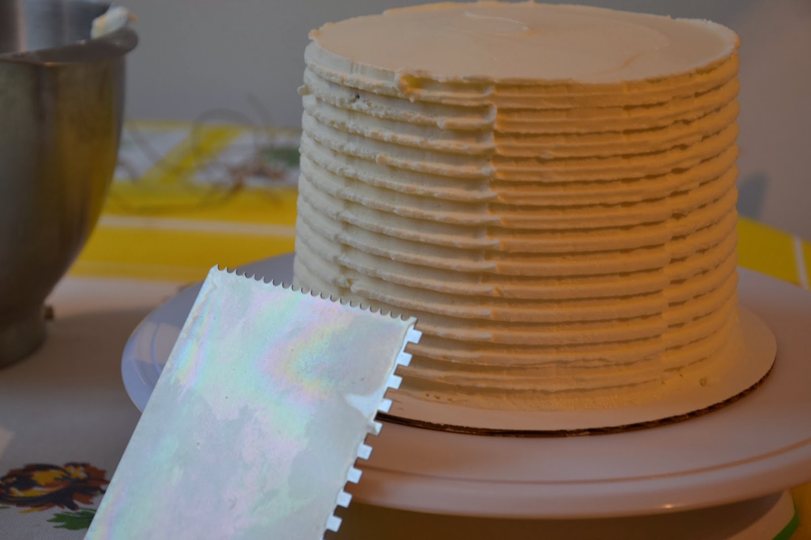 I tried a new technique of carving in the frosting with notched cake trimmer.  It was my first time trying to make this square-edged design work.  It turned out….ok.  I’m still learning so the results should improve with more practice. And more buttercream.